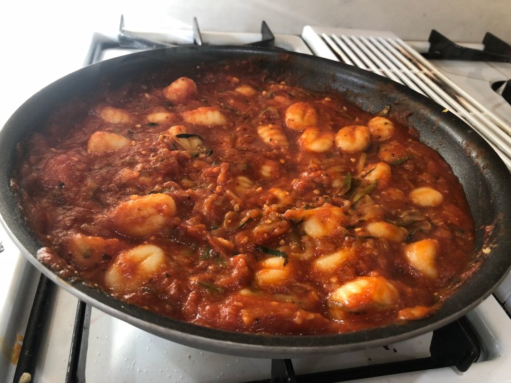 - Combine pasta sauce, cooked gnocchi, and add some parmesan cheese on top.