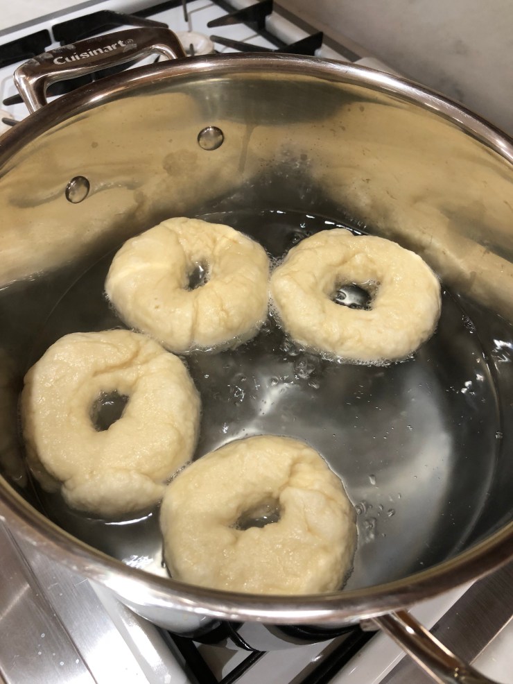 - Once they are sufficiently bagel-shaped, cover them again with a warm towel for another 20 minutes. While they are resting, bring a big pot of water with 1 gallon of water and 1 Tbsp sugar to a boil.